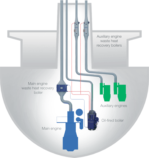 The waste heat from the auxiliary engines has not been considered in the past, but it actually contains a large amount of energy which can be utilized to supplement steam requirements during port stays and - for some vessels - also during voyage. The WHR concept has been developed as a customized solution with special focus on energy generation compared to return on investment and has a very short payback time of down to 4-6 months in optimum cases, but normal payback time will be approximately 1 to 1½ year depending on the number of days the produced steam can be utilized (offset against the steam requirement from the oil fired boiler) and the redundancy requirements.