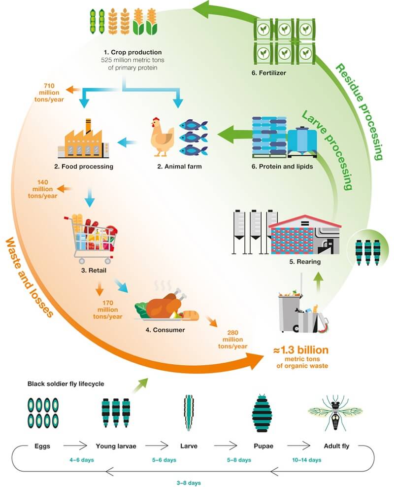 De plus, les insectes transforment les déchets alimentaires en protéines utilisables, ce qui rend le cycle de production alimentaire plus durable.